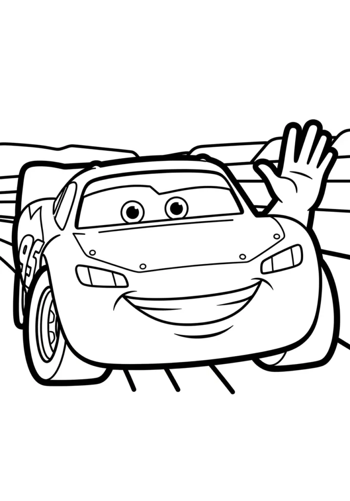 This design features Lightning McQueen smiling brightly while waving with a playful cartoon glove in the background. The lines are bold and clear with simple background elements that add movement without crowding the page. The car is slightly angled which gives the whole page a fun and welcoming energy.