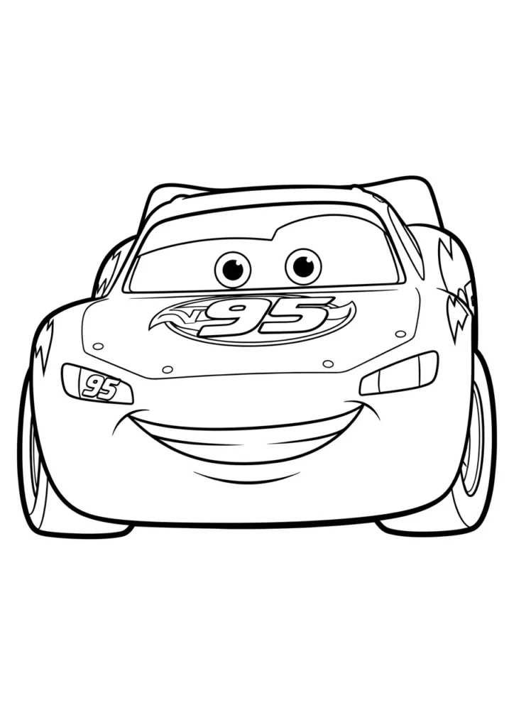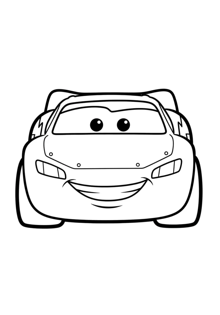 This design shows Lightning McQueen facing forward with a cheerful racing ready expression. The front view keeps the focus on the smile and eyes while the body remains simple and open. The line thickness is consistent which helps the page feel neat and approachable.