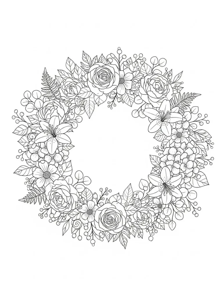 This coloring page features a beautifully detailed floral wreath arranged in a soft circular shape with an open center. Roses, lilies, small blossoms, berries, and layered leaves are woven together to create a rich and balanced composition. The line work is fine and precise, with plenty of overlapping petals, textured leaves, and tiny details that invite careful coloring. The symmetry feels gentle rather than rigid, which keeps the design flowing and organic while still offering a satisfying level of complexity.