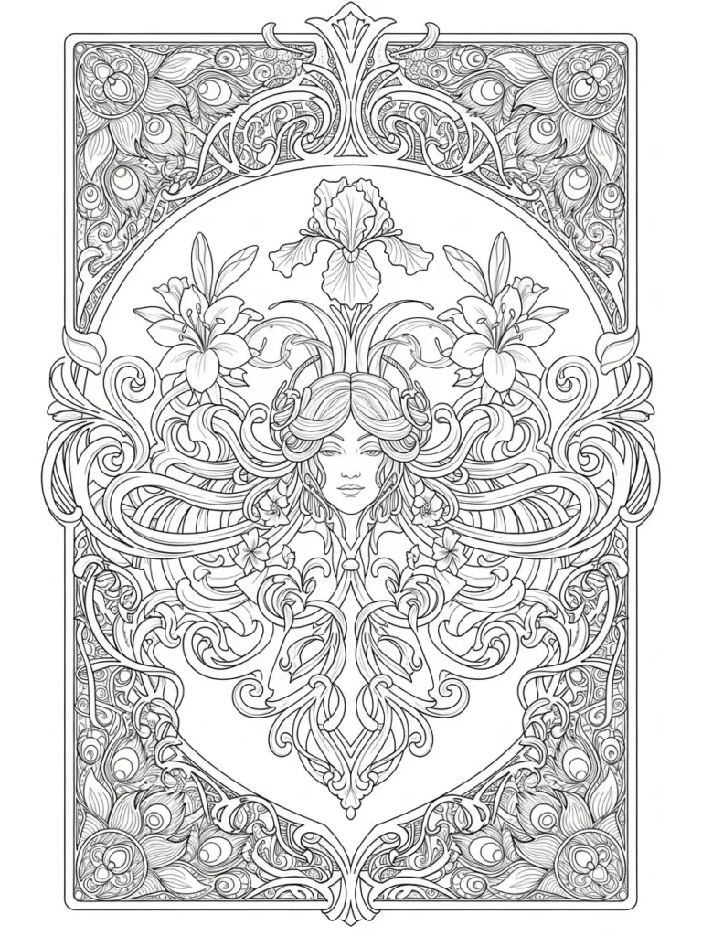 This coloring page features a graceful female figure framed by flowing Art Nouveau inspired lines, blooming lilies, and ornate decorative borders. Her hair blends seamlessly into swirling patterns and botanical shapes, creating a soft sense of movement across the entire design. The composition is symmetrical and balanced, with fine line work filling the background, frame, and floral elements with elegant curves and layered details that invite slow and careful coloring.