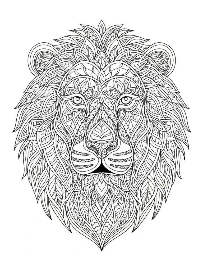 This coloring page features a powerful lion face built from layered mandala patterns, flowing lines, and detailed geometric shapes. The mane spreads outward in a balanced and symmetrical design, filled with repeating curves, leaf like forms, and fine textures that frame the expressive eyes and strong features. The line work is clean and precise, creating many small sections that make the design feel bold, intricate, and beautifully structured.
