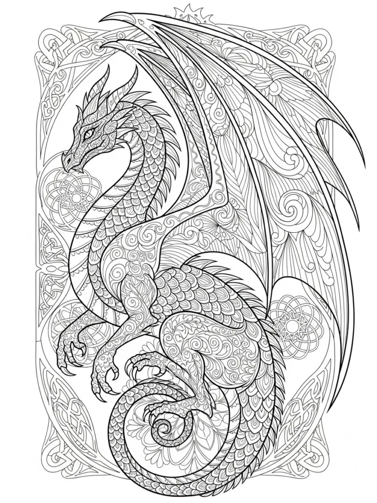 This coloring page features a powerful dragon posed in a dramatic curved stance, surrounded by flowing wings, scales, and intricate ornamental details. Every part of the dragon is filled with fine patterns, from the layered scales along its body to the delicate lines inside the wings and tail. Decorative borders and circular motifs frame the scene, adding structure while keeping the overall design rich and detailed. The line work is thin and precise, creating plenty of small sections that make this page feel complex and impressive.