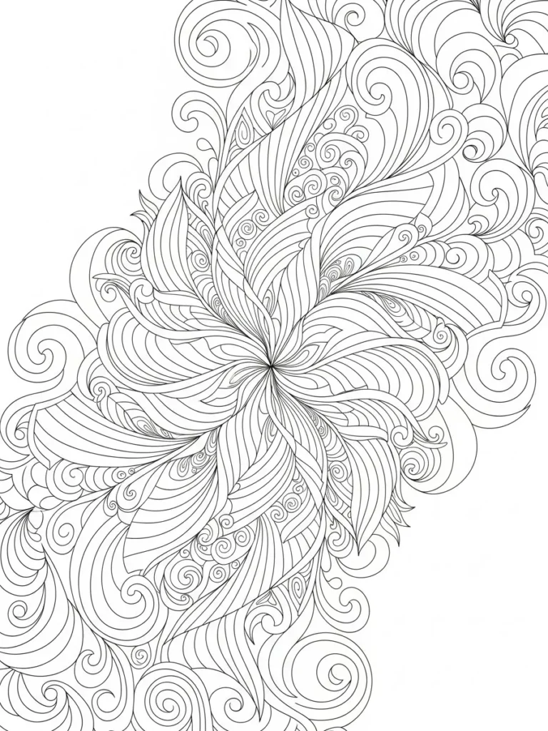 This coloring page showcases a sweeping abstract design made up of layered leaf shapes, curling lines, and elegant spirals that radiate outward from a central point. The composition feels fluid and almost wind swept, with fine line work that creates depth through repetition and movement. Each section is packed with narrow segments and gentle curves, giving the whole page a sense of motion while still feeling balanced and intentional.