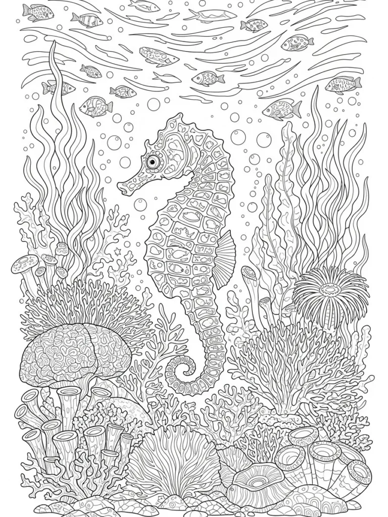 This coloring page features a detailed underwater scene centered around a graceful seahorse floating among coral, sea plants, and tiny fish. The seahorse body is filled with small patterned segments and textured lines, while the surrounding reef is packed with flowing seaweed, coral shapes, bubbles, and layered ocean details. The line work is fine and consistent throughout, creating a busy but beautifully balanced composition that feels full of life.