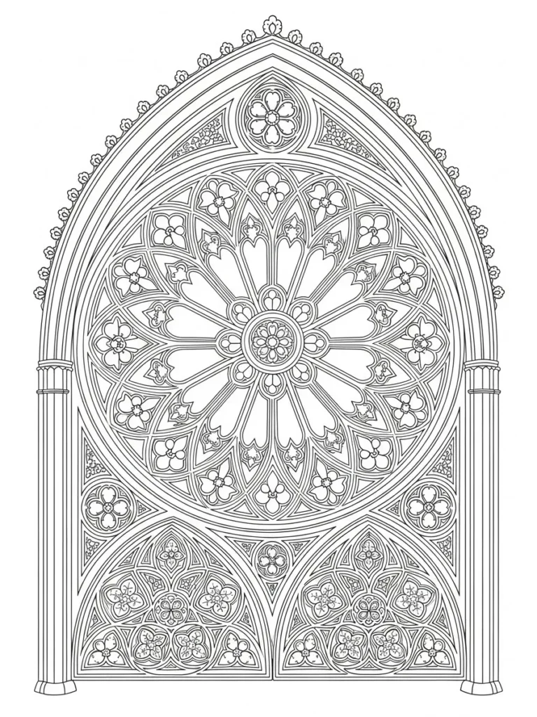This coloring page features a tall arched window design inspired by classic cathedral architecture. At the center sits a large rose window filled with floral motifs, petal shapes, and repeating geometric sections. Smaller panels below echo the same patterns with tiny blossoms and curved details. The line work is fine and precise, with clean borders that separate each segment and create a beautiful stained glass effect that feels structured and detailed from top to bottom.