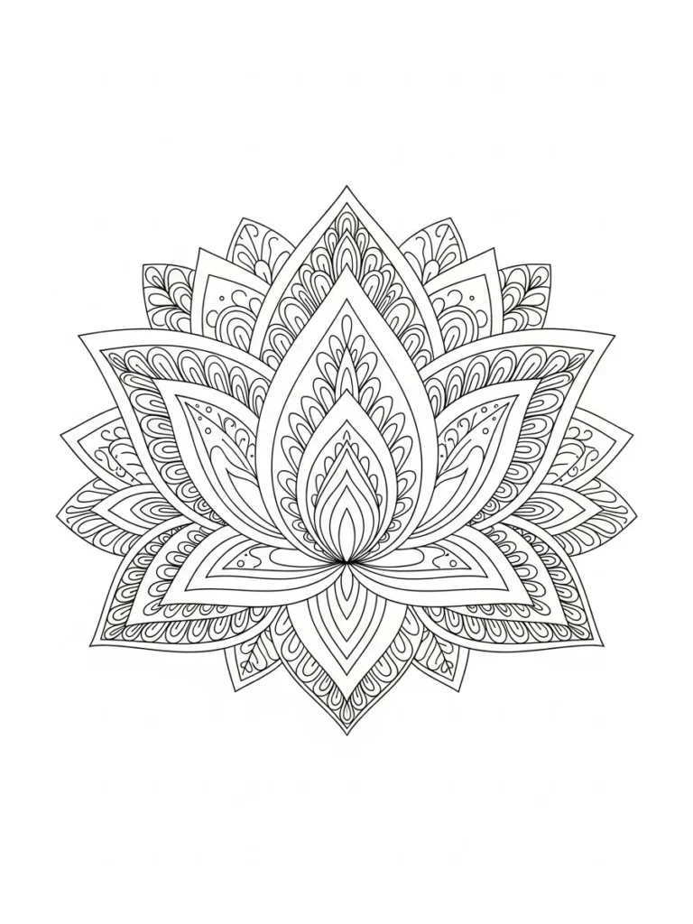 This coloring page features a beautifully symmetrical lotus flower built from multiple layers of pointed petals that radiate outward from the center. Each petal is filled with fine line patterns, curved shapes, and repeating details that create a rich sense of depth. The design feels balanced and intentional, with clean thin line work and plenty of small sections that invite careful coloring while keeping the overall shape calm and harmonious.