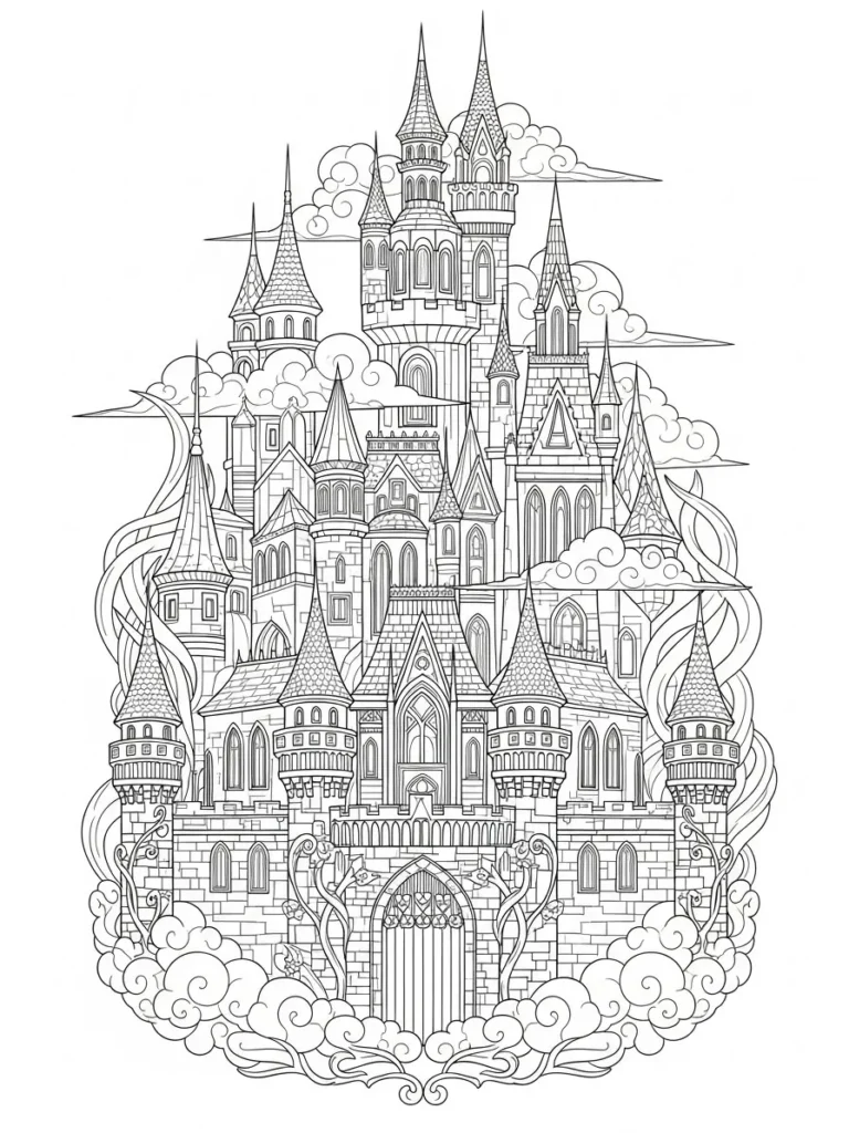 This coloring page features a tall and whimsical castle filled with layered towers, pointed rooftops, arched windows, and stone textures stacked from bottom to top. Swirling clouds and flowing decorative lines frame the structure, adding movement and a dreamy storybook feel. The line work is fine and detailed, with lots of small architectural elements like bricks, roof patterns, and ornate doors that make the layout feel rich and full without looking cluttered.
