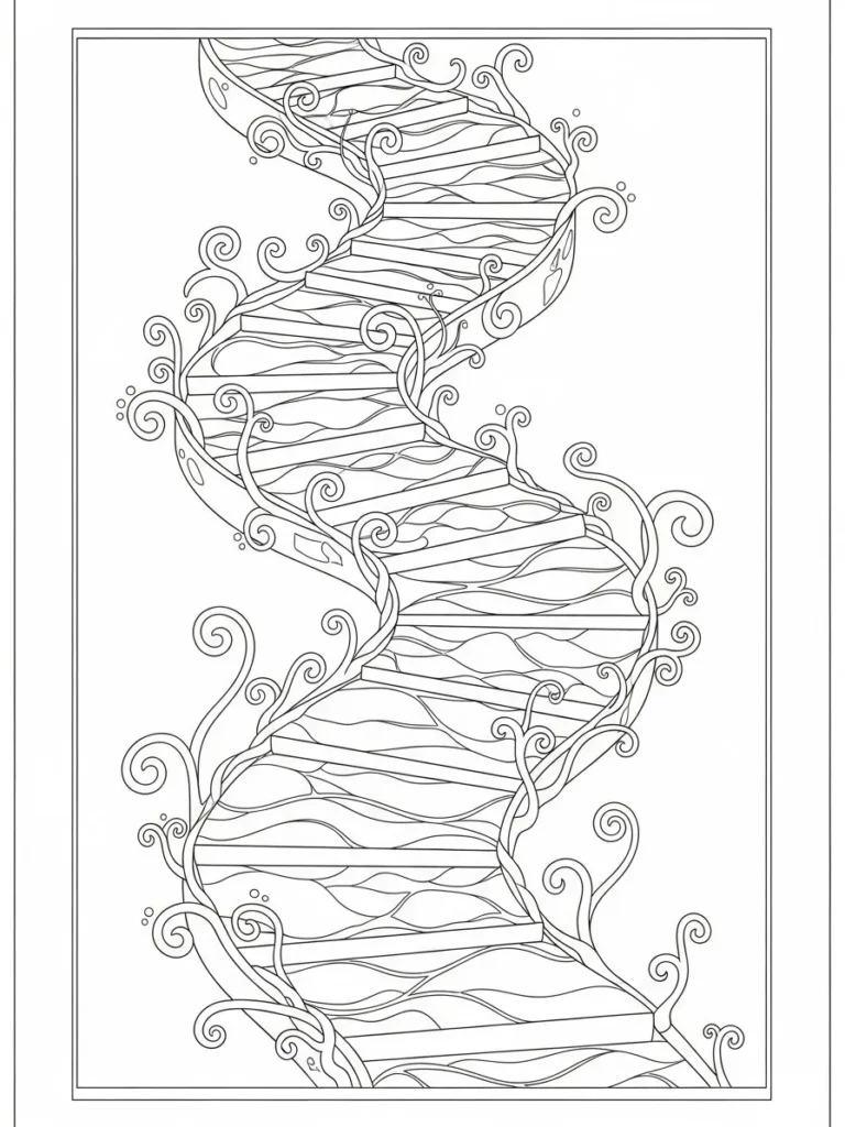This coloring page features a graceful winding staircase that moves upward in a soft wave like motion. The steps are filled with gentle flowing lines that create a woodgrain style texture, while curling vine like swirls wrap around the edges and trail into the open space. The line work is clean and balanced with medium thickness outlines that keep the design detailed without feeling crowded. The tall vertical layout gives the whole page an airy feeling, with plenty of breathing room between the curves and patterns.