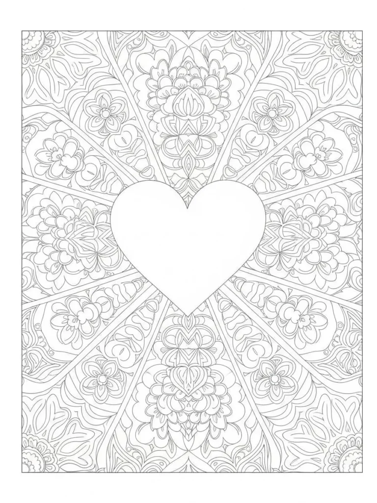 This coloring page features a large open heart at the center, surrounded by intricate mandala style sections that fan outward like gentle rays. Each segment is filled with floral motifs, leafy shapes, and soft flowing patterns that feel detailed but thoughtfully organized. The line work is fine and consistent, giving the design an elegant look while keeping everything easy to follow. The square frame adds structure, while the heart centerpiece creates a calm focal point that naturally draws the eye inward.