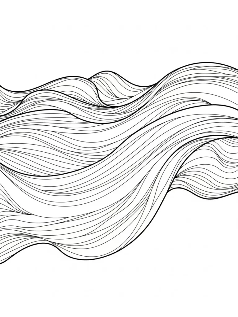This coloring page features a wide sweep of smooth flowing lines that move across the page like soft waves. The lines vary slightly in thickness and spacing, creating natural rhythm and depth without adding busy details. The open layout leaves plenty of white space around the curves, which keeps the design airy and calm. Everything feels fluid and continuous, with no sharp corners or interruptions to break the flow.