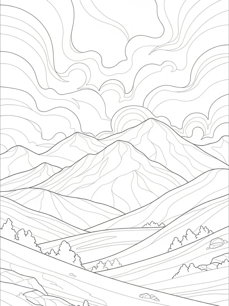 I love coloring this page when I want my thoughts to slow down naturally. Moving across the hills one section at a time feels grounding, like watching the landscape unfold without any rush. I usually reach for calming blues, greens, and warm neutrals, and it feels really satisfying to blend them softly across the slopes. This one always gives me that quiet expansive feeling, like taking a deep breath and enjoying the view for a while.