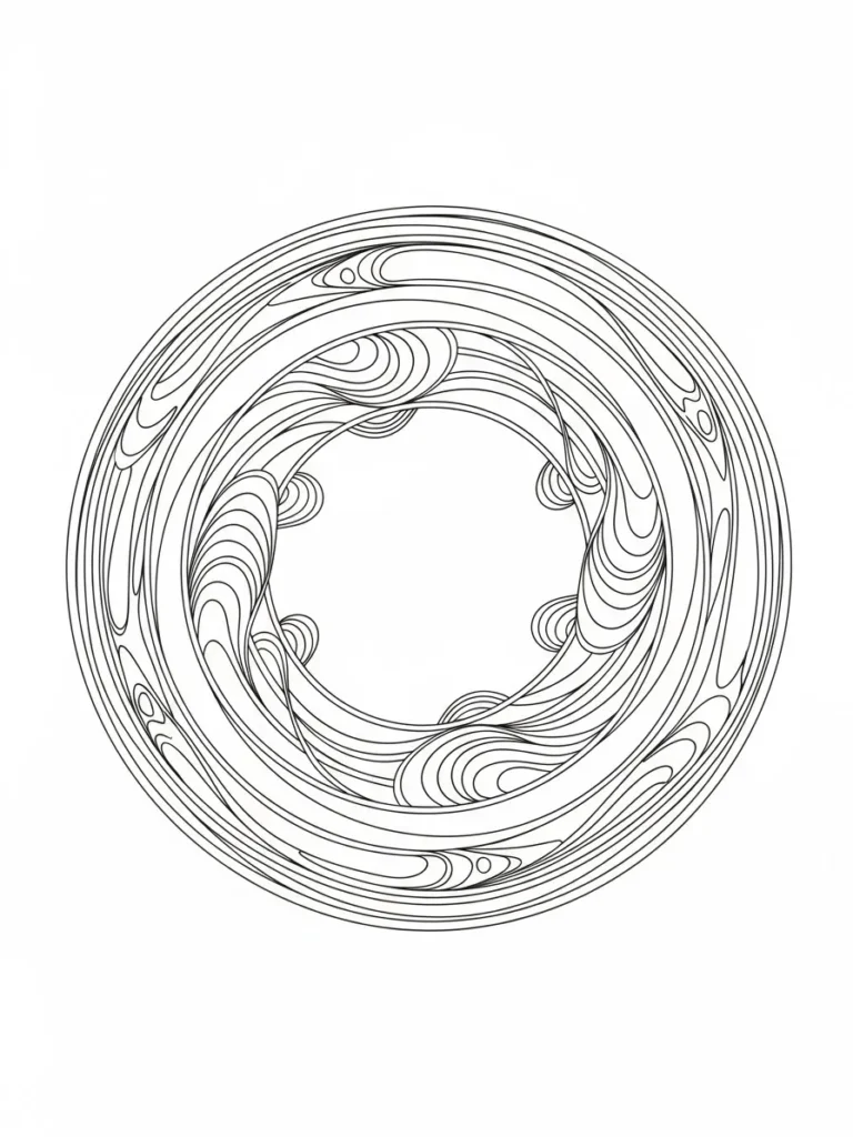 This design features a large circular ring filled with smooth flowing lines that gently loop and curve around the center. The inner circle is left open and calm, while the surrounding band is layered with organic wave patterns that feel balanced and rhythmic. Line thickness varies just enough to create movement without overwhelming the page, and the overall layout feels centered and soothing with a strong sense of flow.