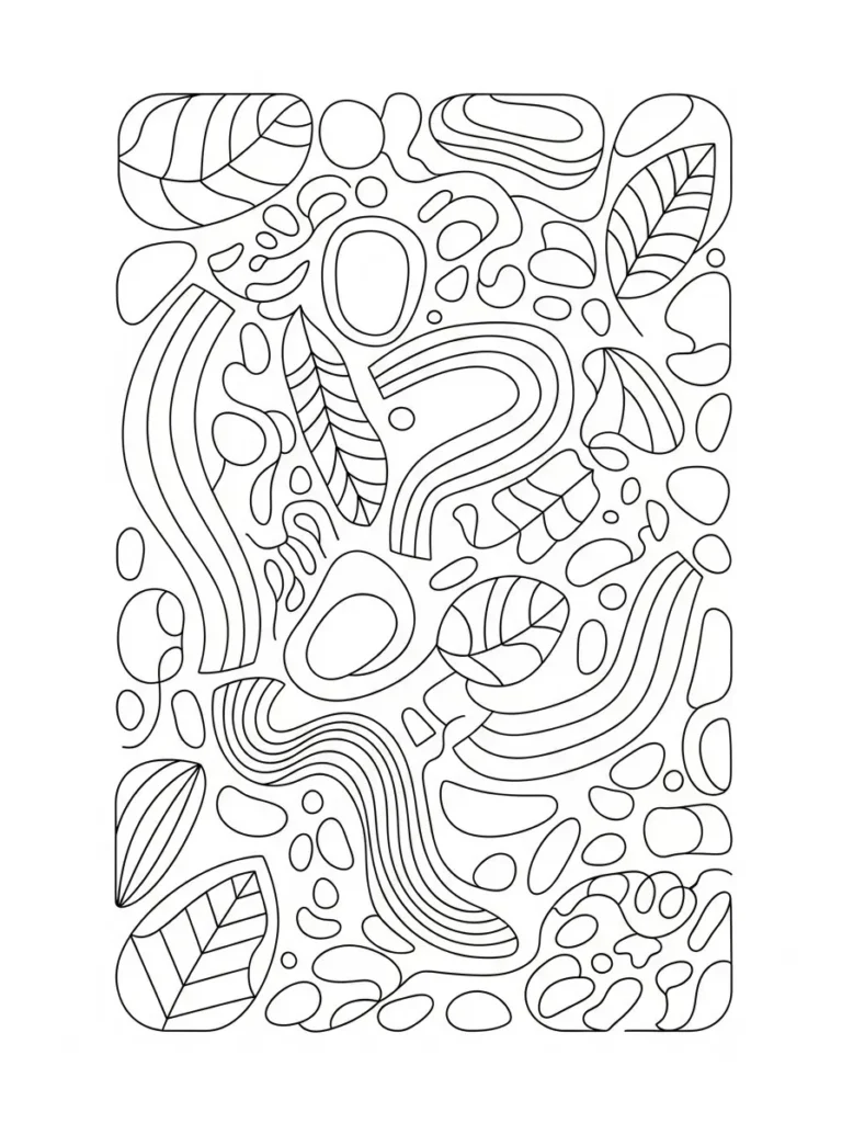 This coloring page features an abstract mix of soft organic shapes, flowing lines, and leaf inspired forms scattered across a tall rectangular layout. Curved bands weave through rounded blobs and pebble like shapes, creating a sense of motion without feeling chaotic. The line work is smooth and even, with simple patterns inside some shapes and open spaces in others. Everything feels loosely connected, giving the page a relaxed modern look that is easy on the eyes.