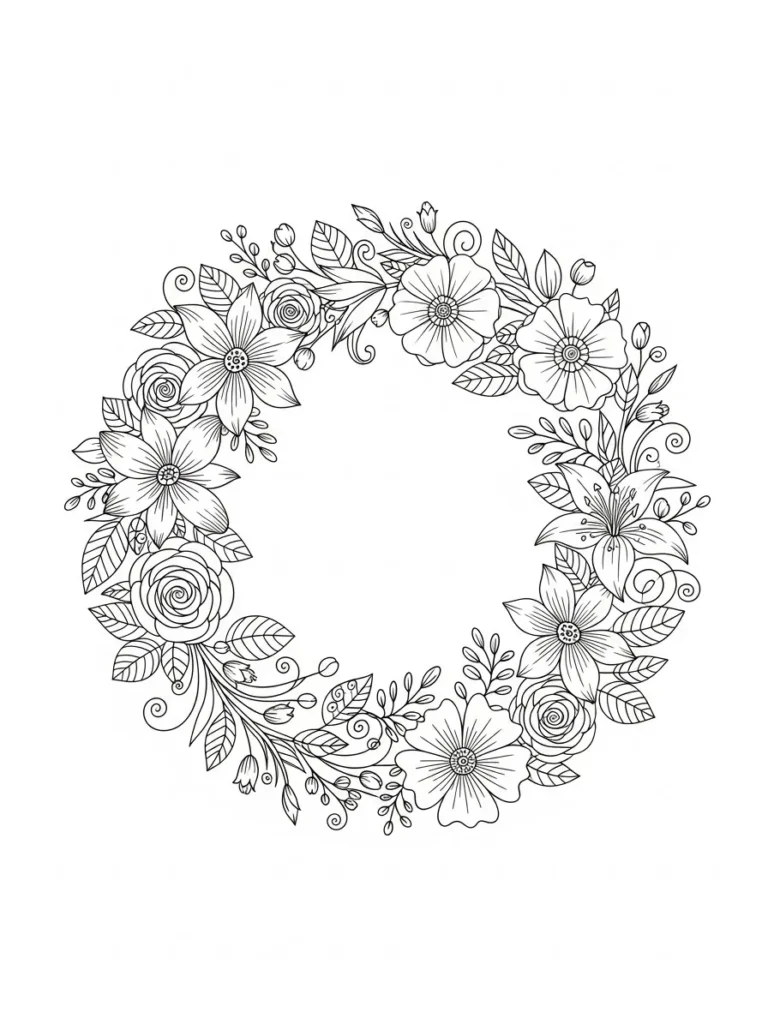 This coloring page features a delicate floral wreath arranged in a gentle circular shape. A mix of blooming flowers, leafy branches, tiny buds, and soft swirling accents wrap around the open center, creating a light and balanced design. The line work is clean and elegant with fine details that feel intricate without being overwhelming. The open middle space gives the whole page a calm airy feel while letting the floral details shine.