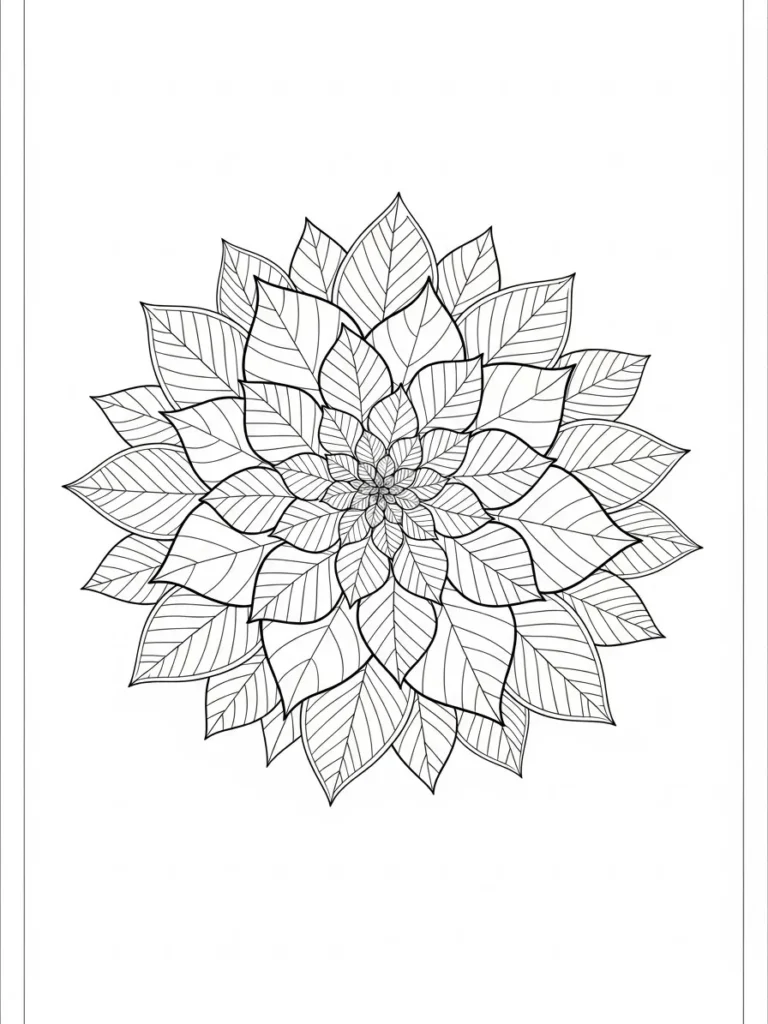 This coloring page features a beautifully balanced mandala made entirely of layered leaves radiating outward from the center. Each leaf is outlined with clean smooth lines and filled with gentle vein details that add texture without crowding the design. The circular layout feels symmetrical and calm, with the leaves overlapping slightly to create depth and flow. The generous white space around the mandala keeps everything feeling light and centered.