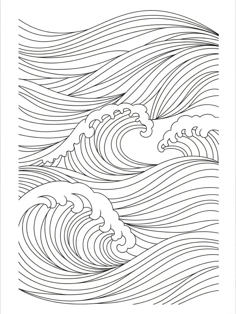 I love coloring this page when I want to calm my thoughts and settle into a steady rhythm. Following the curves of the waves feels soothing, and I find myself breathing more evenly as I move from line to line. Some days I go with classic blues and sea greens, other times I play with unexpected colors just for fun. This one always makes coloring feel peaceful and grounding, like letting my mind drift with the tide for a while.
