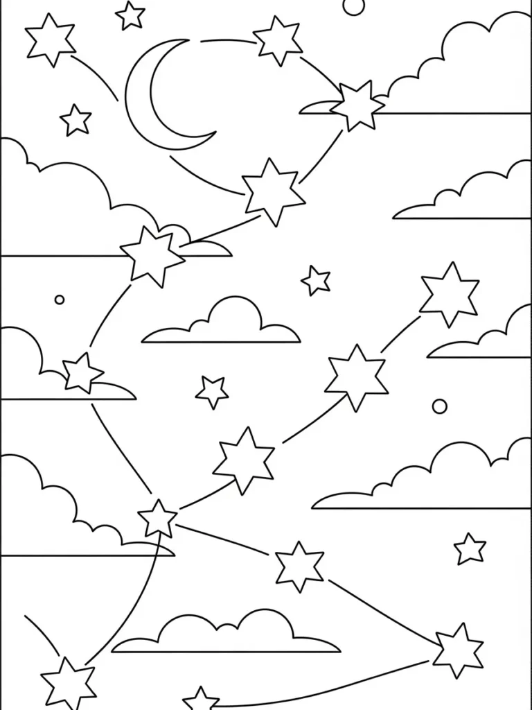 This coloring page shows a peaceful night sky filled with scattered stars, soft rounded clouds, and a slim crescent moon floating above it all. The stars are connected by flowing curved lines that gently guide your eye across the page, creating a sense of movement without feeling busy. The line work is smooth and clean with simple shapes and plenty of open space, which keeps the design light and airy. Everything feels evenly spaced, making the whole layout calm and easy on the eyes.