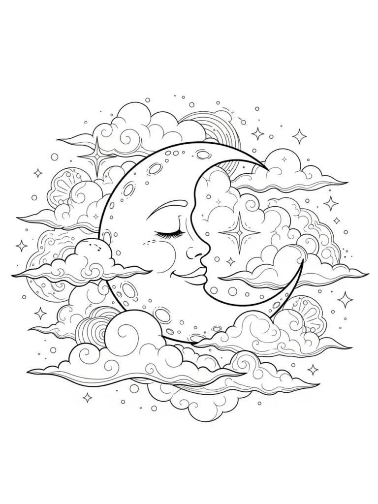 This coloring page features a serene crescent moon with a peaceful face nestled among soft swirling clouds. Tiny stars, sparkles, and gentle curves fill the background, creating a dreamy night sky that feels light and whimsical. The line work is clean and smooth, with a lovely balance of open space and delicate details in the clouds and moon surface. Everything flows naturally around the central moon, giving the design a calm and comforting layout.