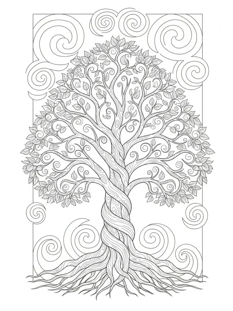 This coloring page features a beautifully flowing tree with twisting branches, curling leaves, and softly spiraled accents surrounding it. The trunk weaves upward with elegant lines that feel almost braided, while the roots spread out in calm grounding curves at the base. Small leaves fill the canopy, balanced by airy swirls that frame the tree without crowding it. The line work is fine and consistent, creating a detailed yet soothing layout that feels both lively and peaceful.