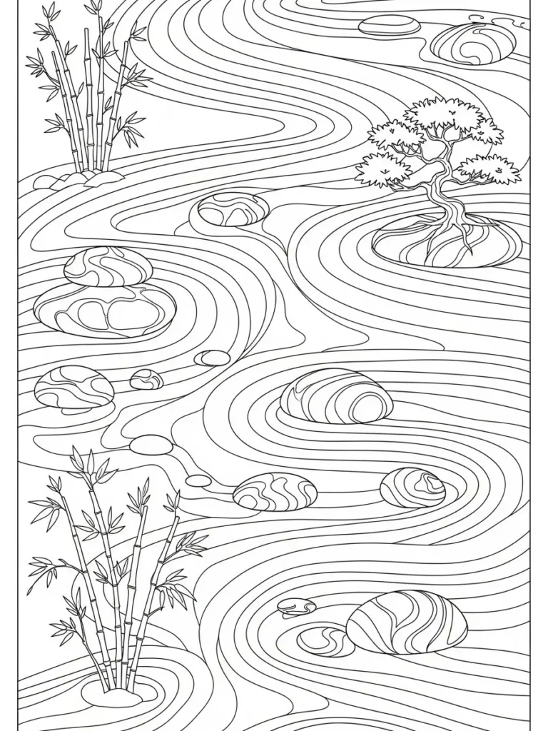 This coloring page features a peaceful zen garden scene made up of smooth flowing lines that wind gently across the page. Rounded stones rest along the paths, while clusters of bamboo and a small tree add natural balance and interest. The lines are clean and steady, creating soft movement without feeling busy, and the tall layout lets the scene unfold slowly from top to bottom. Everything feels intentionally placed, giving the design a calm organized rhythm.