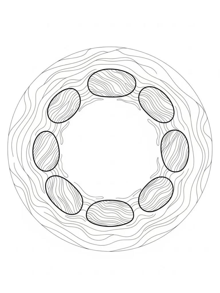 This coloring page features a calm circular design with smooth oval shapes arranged in a balanced ring. Each oval is filled with gentle wave like lines that echo the flowing patterns around the outer circle. The line work is thin and even, creating a soft rhythmic feel without sharp edges. The open center adds a sense of space and calm, while the repeating curves give the whole design a grounded and meditative layout.
