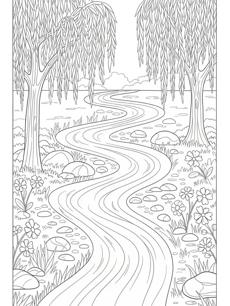 This coloring page shows a gentle river like path curving through a peaceful meadow, framed by tall leafy trees and clusters of wildflowers. Smooth flowing lines guide the eye along the winding water, while rounded stones, grasses, and soft clouds add natural texture throughout the scene. The line work is clean and consistent with a mix of open areas and light detail, creating a calm balanced layout that feels spacious and inviting from top to bottom.