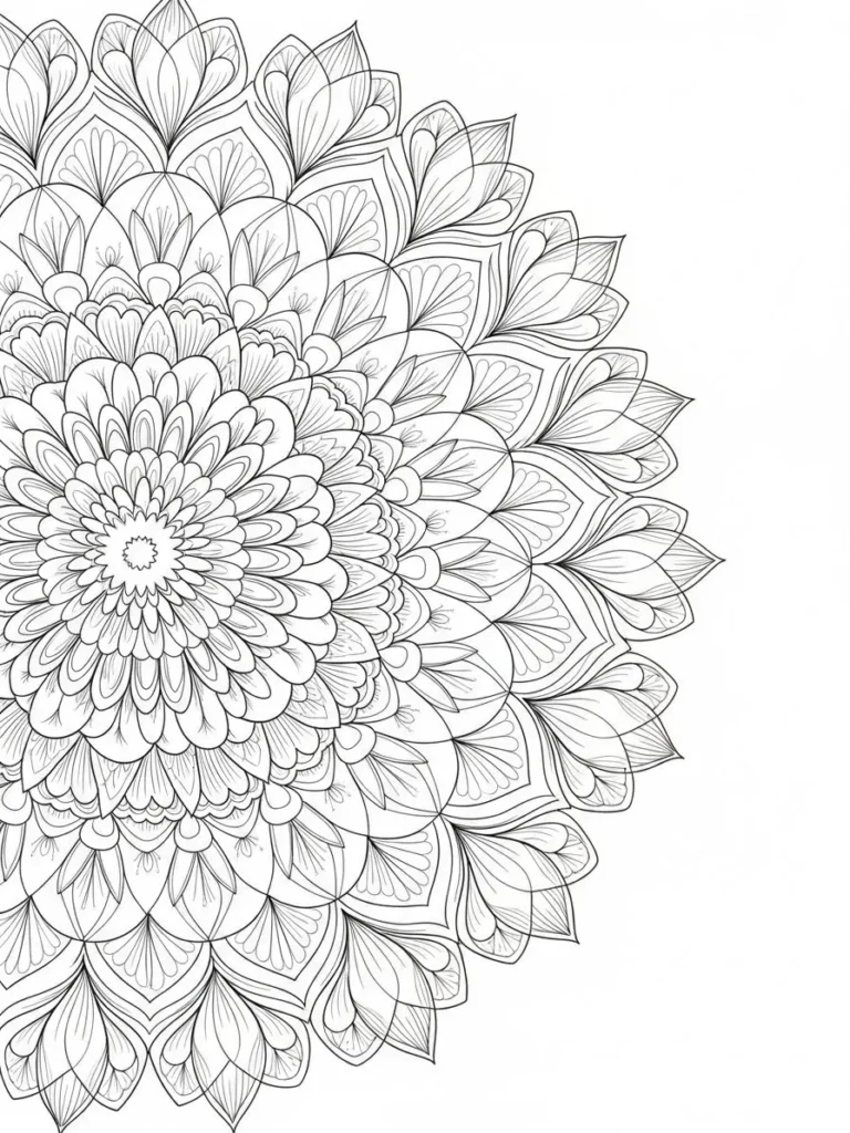 This coloring page features a detailed circular mandala made up of many layered rings filled with petals, dots, swirls, and repeating ornamental shapes. Each section flows neatly into the next, creating a strong sense of symmetry and balance from the center outward. The line work is fine and precise, offering lots of small spaces to color while still feeling organized and intentional. The round layout keeps the design grounded and centered, making it visually soothing from every angle.