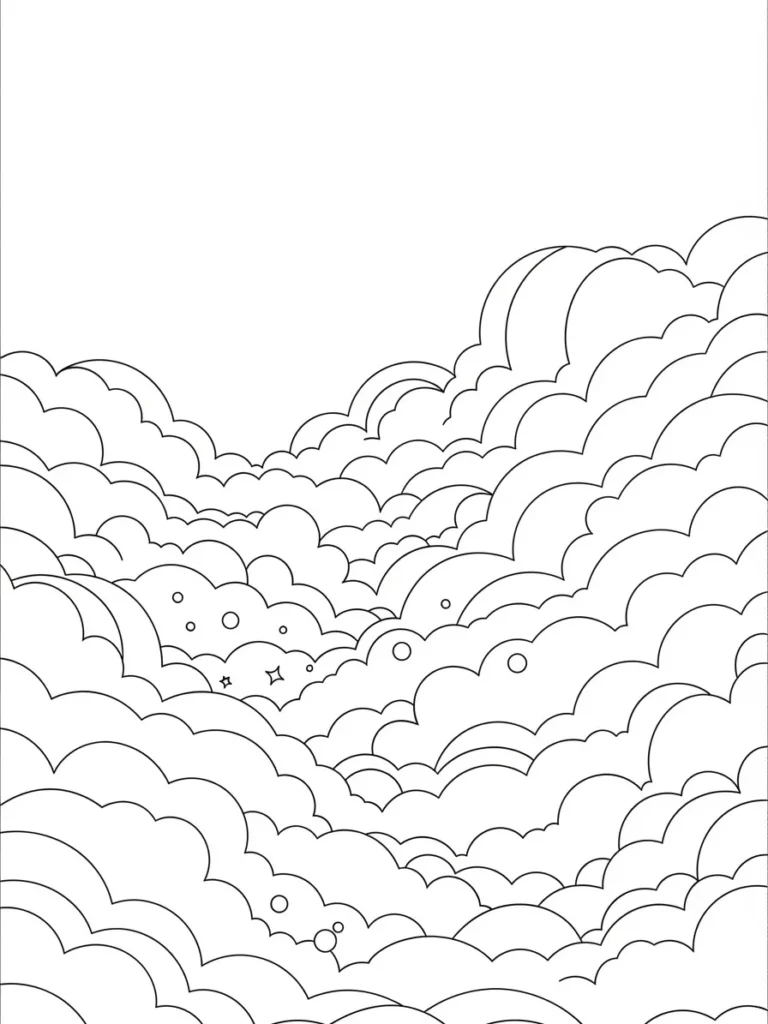 This coloring page is filled with gentle rounded clouds stacked in flowing layers that stretch across the page. The design uses smooth curved lines and repeating cloud shapes to create depth without feeling heavy or crowded. Small dots and tiny star details peek through in a few places, adding a subtle sense of whimsy. The line work is clean and even, with lots of open areas that make the layout feel light, airy, and calm.