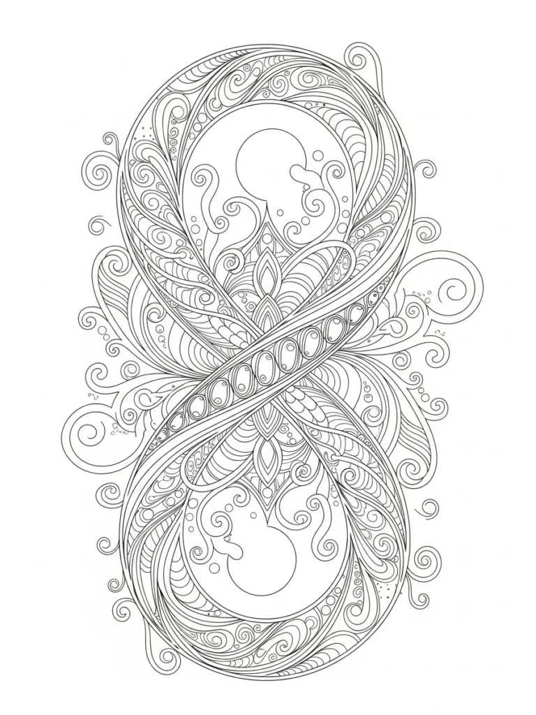 This coloring page features an elegant infinity shape filled with swirling lines, leaf like motifs, and delicate decorative details. The design weaves smoothly from top to bottom, with soft curves looping into each other and creating a sense of endless movement. Fine line work adds texture and interest without feeling overwhelming, while the open circular spaces inside the loops give the whole piece room to breathe. The overall layout feels balanced and intentional, with every curve gently guiding the eye along the flow.
