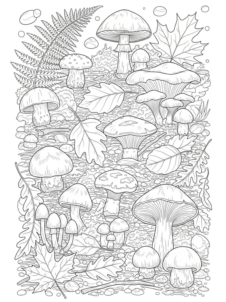 This coloring page is packed with charming forest details, featuring a variety of mushrooms scattered across a cozy woodland scene. Different mushroom shapes and sizes fill the page, surrounded by fallen leaves, ferns, tiny stones, and soft ground textures. The line work is clean and slightly varied, giving the design depth without feeling overwhelming. Everything is arranged in a natural layered way that feels full yet balanced, with plenty of small sections to enjoy coloring at an easy pace.