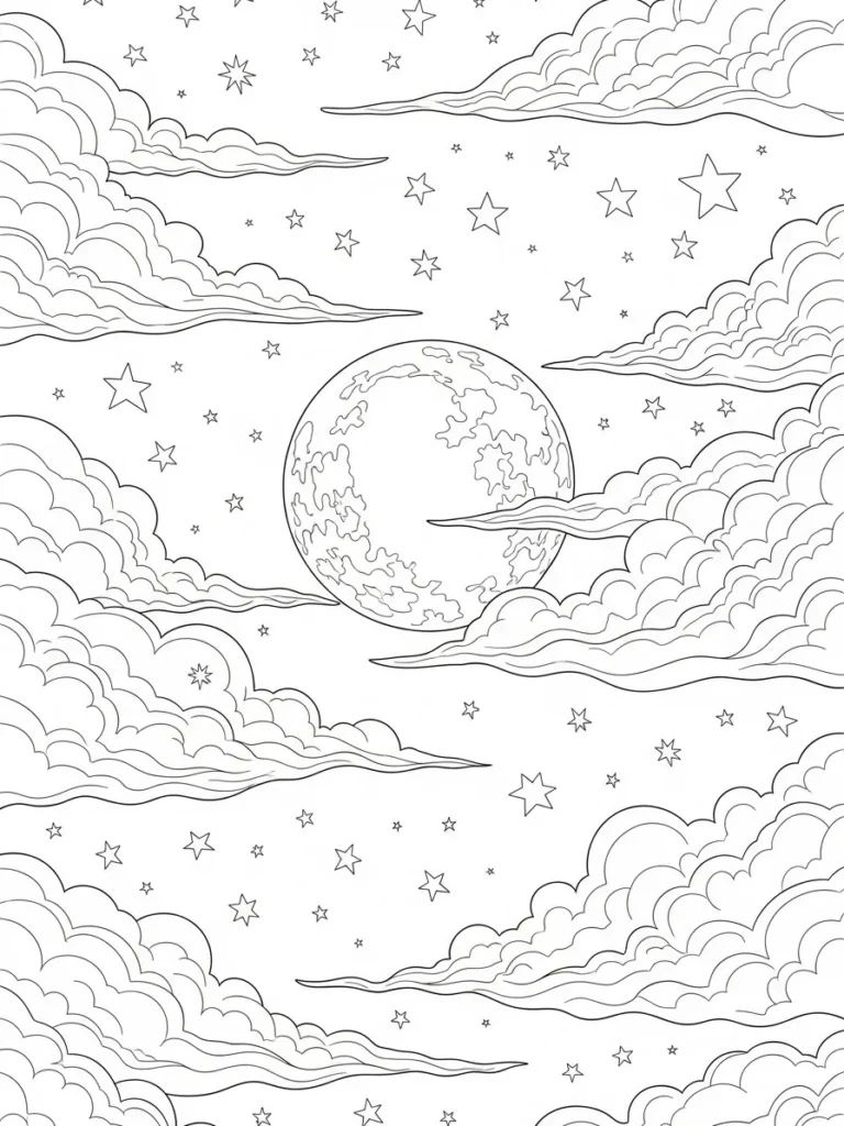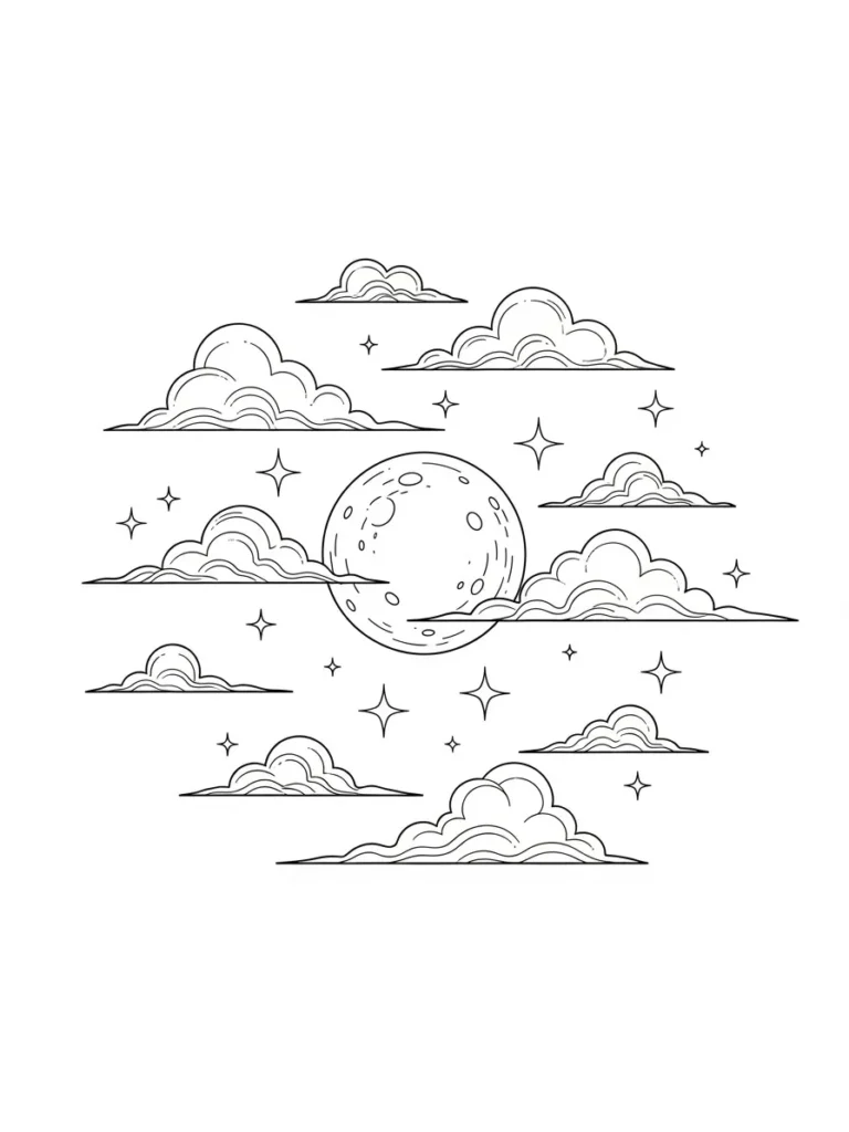 This coloring page shows a peaceful night sky with a full moon floating gently among soft layered clouds. Simple star shapes are scattered throughout the open space, adding just enough sparkle without crowding the scene. The clouds have smooth flowing lines and rounded shapes that feel light and airy, while the line thickness stays clean and consistent for an easy relaxed coloring experience.