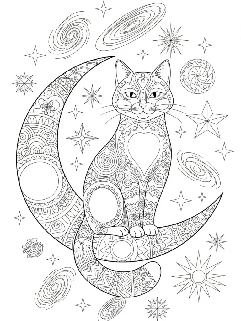 This coloring page features a beautifully patterned cat sitting gracefully on a crescent moon, surrounded by stars swirling galaxies and glowing celestial shapes. The cat is filled with intricate decorative patterns including florals spirals and geometric details that contrast nicely with the smooth curves of the moon. Stars of different sizes and dreamy cosmic accents float all around, creating a balanced layout that feels rich without being crowded. The line work is fine and detailed which makes this page feel extra special and visually engaging.