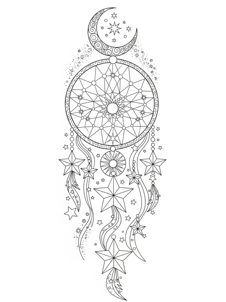 This coloring page features a dreamy celestial dreamcatcher design with a crescent moon resting at the top and a detailed circular web at the center. Delicate lines form the web pattern, accented with tiny stars and dots that feel light and magical. Flowing strands trail downward, decorated with star charms feathers and crescent shapes that create a soft sense of movement. The line work is fine and elegant with a balanced vertical layout that feels detailed without becoming overwhelming.
