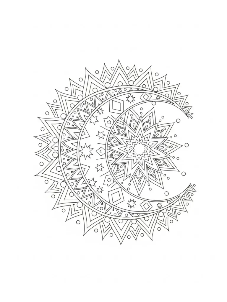 This coloring page features a bold crescent moon wrapped in layers of intricate mandala style patterns and geometric star details. Sharp sunburst shapes radiate outward while smaller stars dots and diamonds fill the space with a balanced rhythm. The layout feels circular and centered with repeating shapes that guide the eye naturally around the design. Line work is clean and precise with enough detail to feel rich without becoming overwhelming.