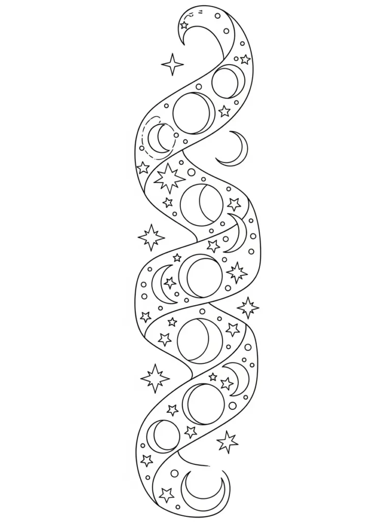 This coloring page features a long flowing ribbon shape that twists gently from top to bottom, filled with repeating moon phases and scattered stars. Crescents and full moons sit neatly inside the curving path while tiny dots and starbursts add a playful celestial texture. The line work is clean and medium weight with lots of open space, giving the whole design a light airy feel that looks elegant without being complicated.