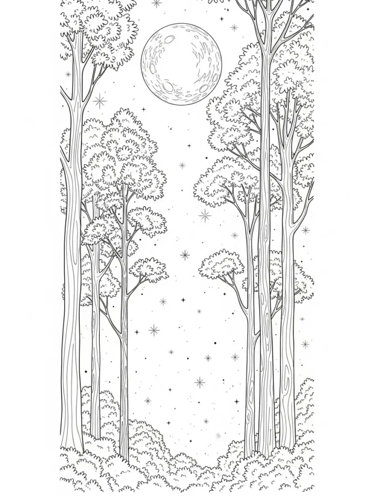 This coloring page shows a tall peaceful forest scene with slender trees rising on both sides and a glowing full moon floating above. Soft clusters of leaves and textured tree trunks frame the open night sky in the center, dotted with tiny stars and sparkles. The layout feels airy and vertical with plenty of open space, while the line work stays fine and gentle which makes the scene feel calm and inviting rather than busy.