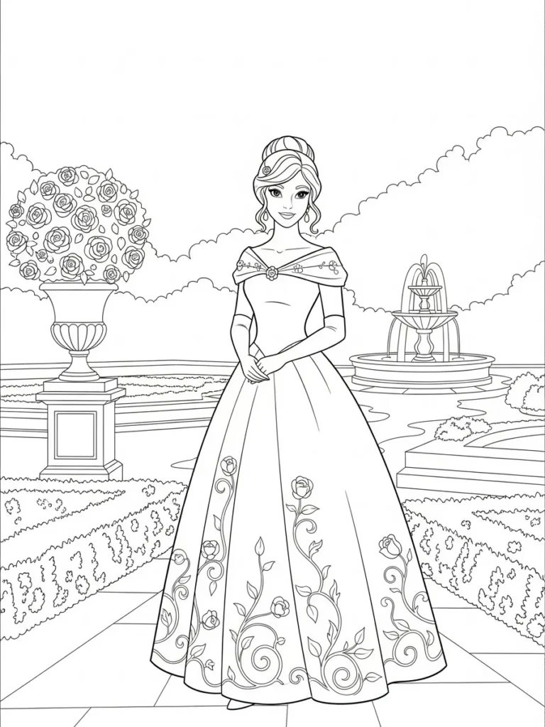 This coloring page features a graceful princess standing in a formal garden setting with manicured hedges, a classic fountain, and ornate planters filled with roses. Her gown flows outward in a soft ball gown silhouette, decorated with delicate floral vines and curling leaf motifs along the skirt. The line art is clean and refined with fine details in the embroidery and slightly bolder outlines around the figure to keep everything clear and easy to color. The balanced layout places the princess at the center while the garden scenery frames her beautifully without feeling crowded.