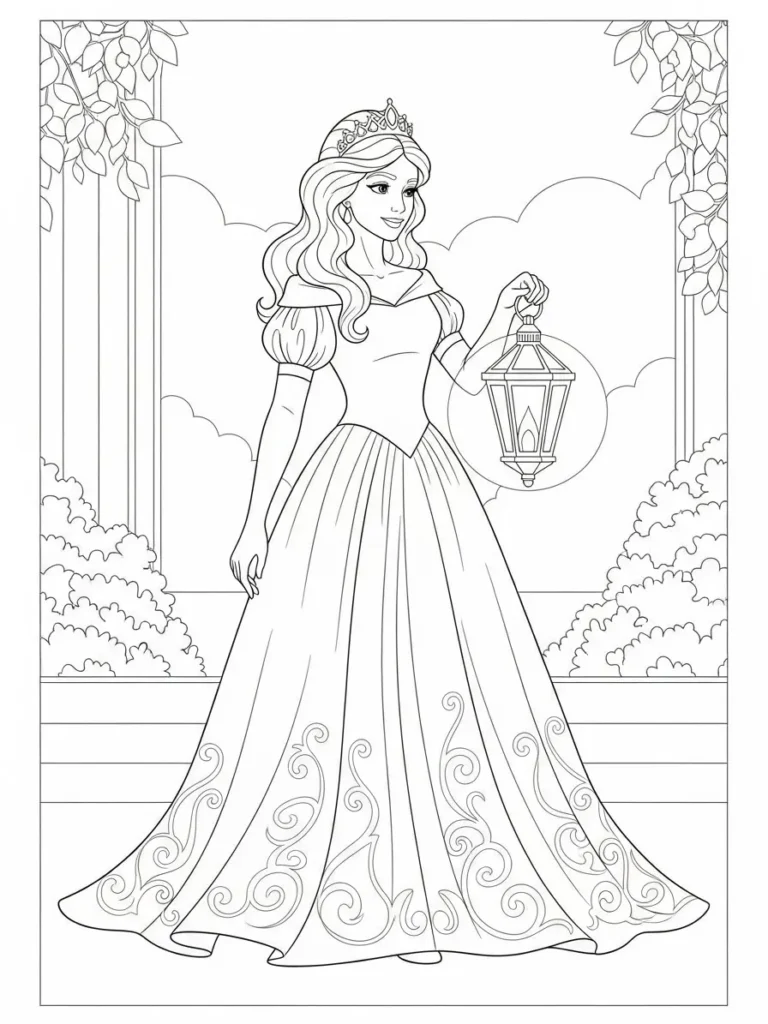 This coloring page features a graceful princess standing in a peaceful garden setting while holding a delicate lantern. Her gown flows softly to the ground with elegant swirling patterns along the hem that add just the right amount of detail. The background is calm and airy with leafy columns, gentle clouds, and rounded bushes that frame her without stealing attention. The line work is clean and balanced with smooth outlines for the dress and finer lines for the decorative details, making the whole scene feel light and inviting to color.