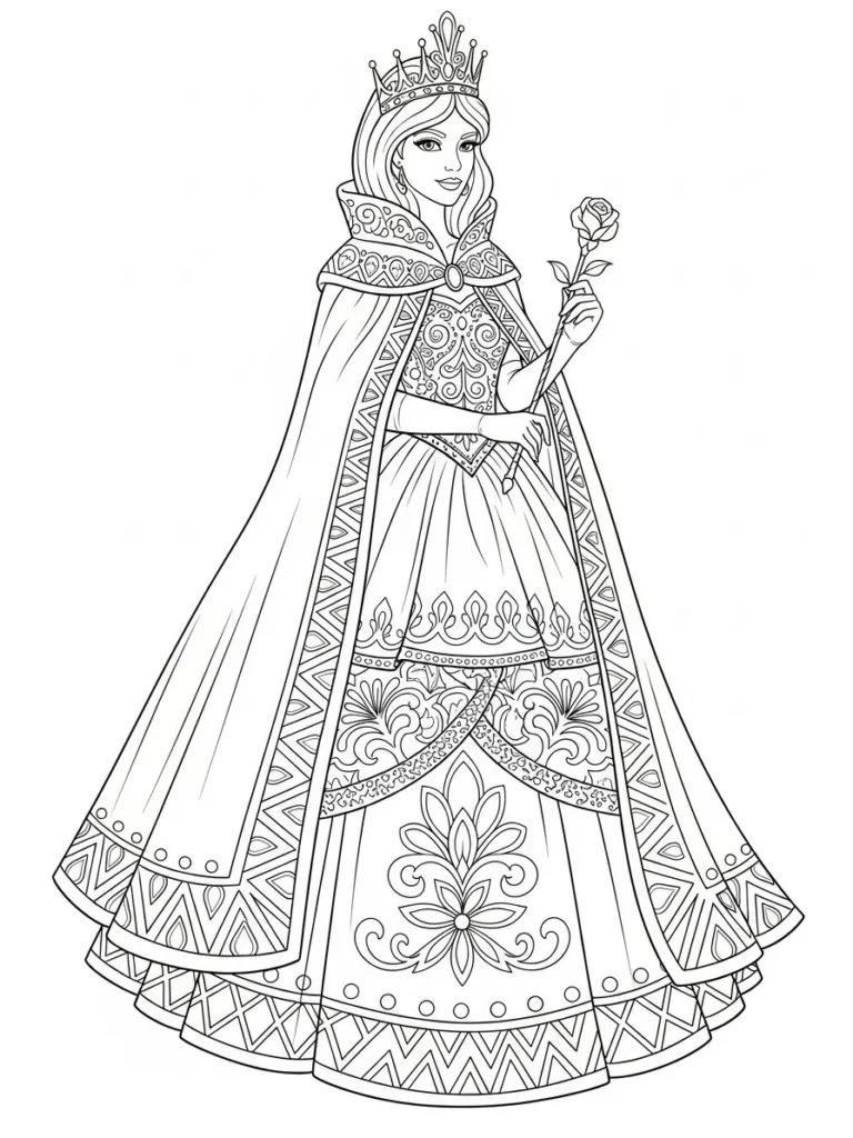 This coloring page features a regal princess standing tall in a flowing gown and an elegant cape trimmed with intricate geometric and floral patterns. Her crown rises gracefully above softly styled hair, while the bodice and skirt are filled with ornate motifs that feel rich and ceremonial. The long cloak frames the figure beautifully and adds movement to the overall layout. Line thickness is clean and confident with fine details throughout the dress and cape, giving plenty of texture while keeping each section clear and satisfying to color.