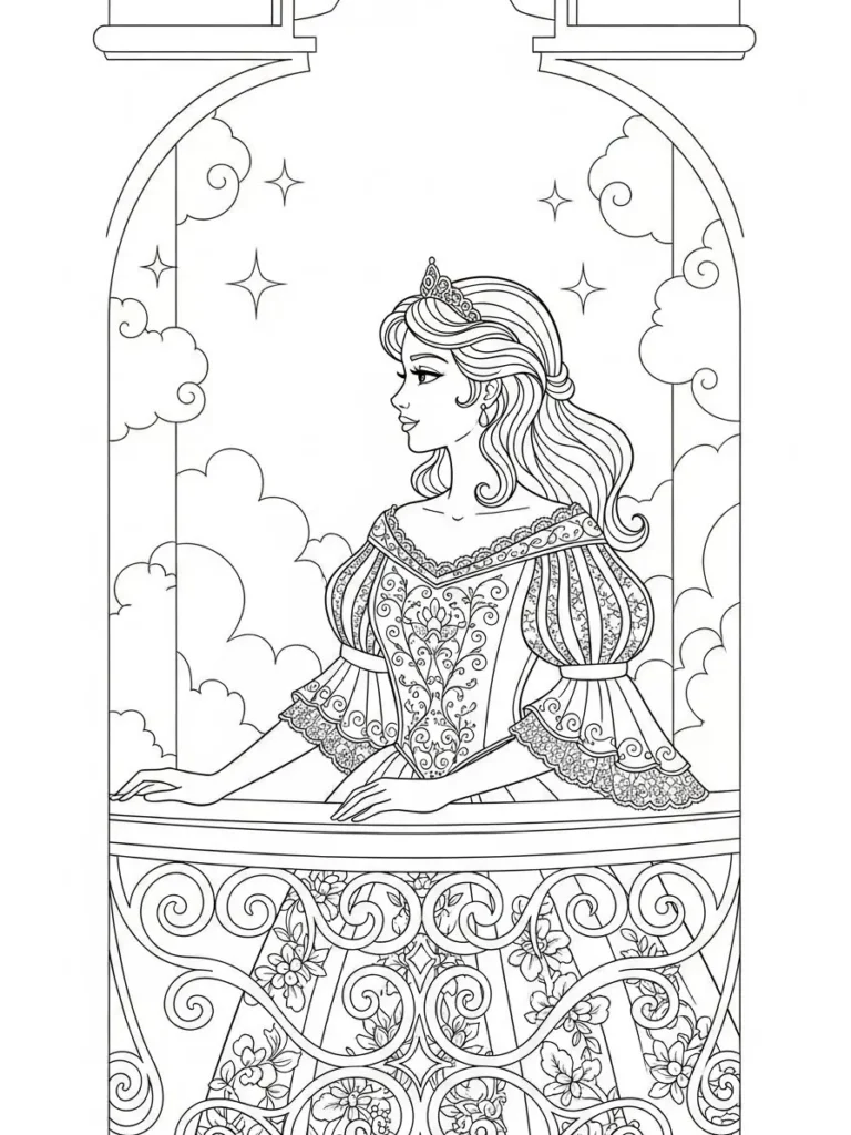 This coloring page features a graceful princess leaning gently against an ornate balcony railing while gazing into a sky filled with soft clouds and twinkling stars. Her gown is rich with decorative embroidery along the bodice and sleeves, paired with flowing fabric that feels elegant and light. The balcony itself is beautifully detailed with swirling floral ironwork that adds depth and visual interest without overpowering the scene. Clean outlines define the figure and architecture while finer lines bring out the delicate patterns, making the layout feel balanced and inviting.