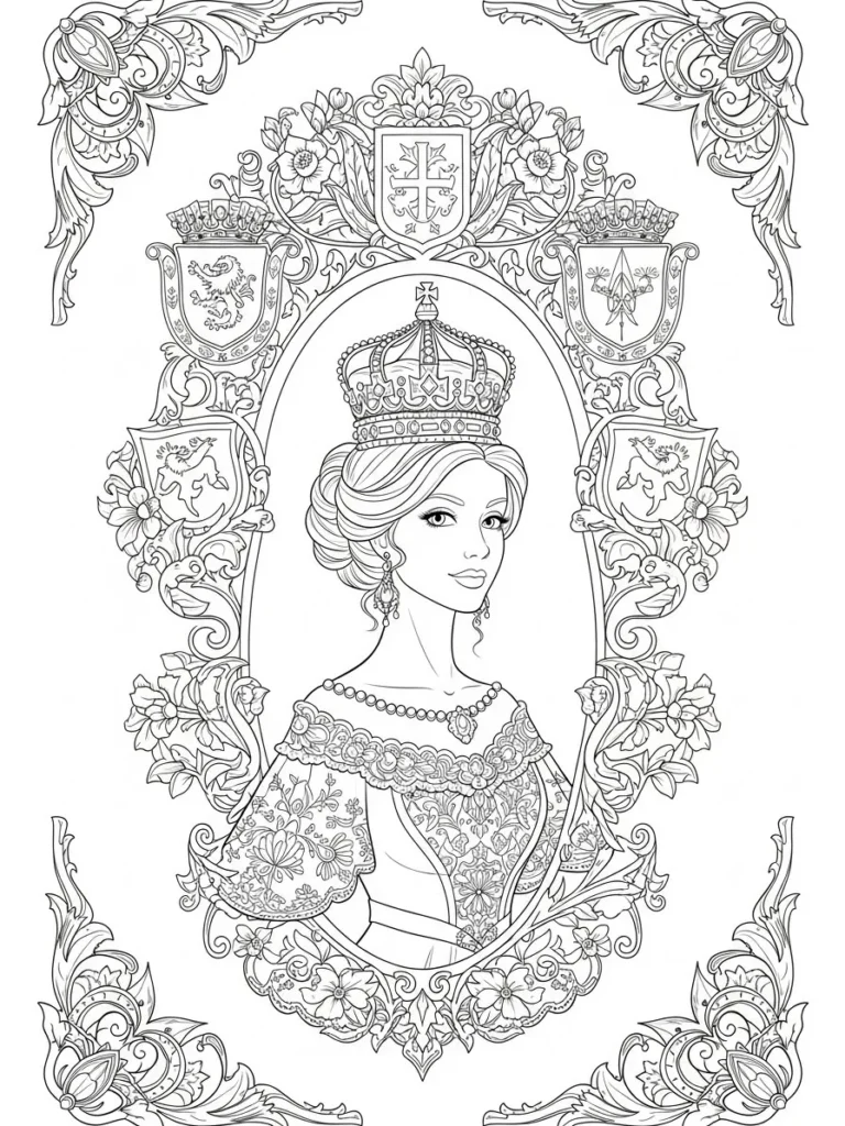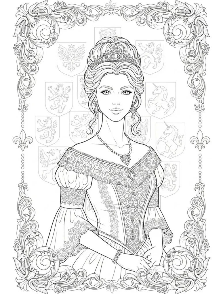 This coloring page features a majestic princess portrait centered within an elaborate ornate frame filled with heraldic symbols, floral scrollwork, and decorative crests. The crown is richly detailed with gemstones and layered metalwork, while the gown includes elegant patterns along the neckline and sleeves that echo the frame’s intricate style. The surrounding border is highly decorative with symmetrical flourishes, shields, and leafy motifs that create a strong sense of balance. Line work is crisp and refined, with fine details throughout that feel luxurious without becoming cluttered.