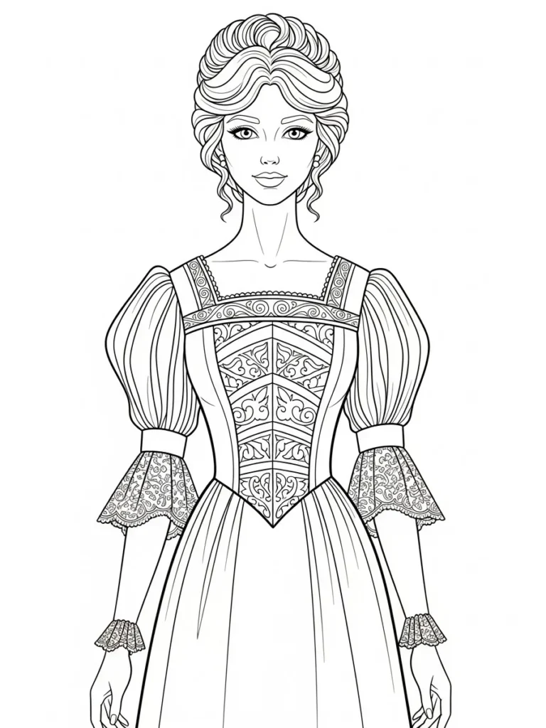 This coloring page features a refined princess standing front facing with a beautifully structured gown that feels timeless and graceful. The bodice is filled with symmetrical ornamental patterns that flow neatly down the center, while the puffed sleeves and lace cuffs add soft decorative detail. The skirt opens into smoother sections that balance out the intricate top, creating a clean and elegant layout. Line work is crisp and consistent, making the details clear and inviting without feeling too dense.