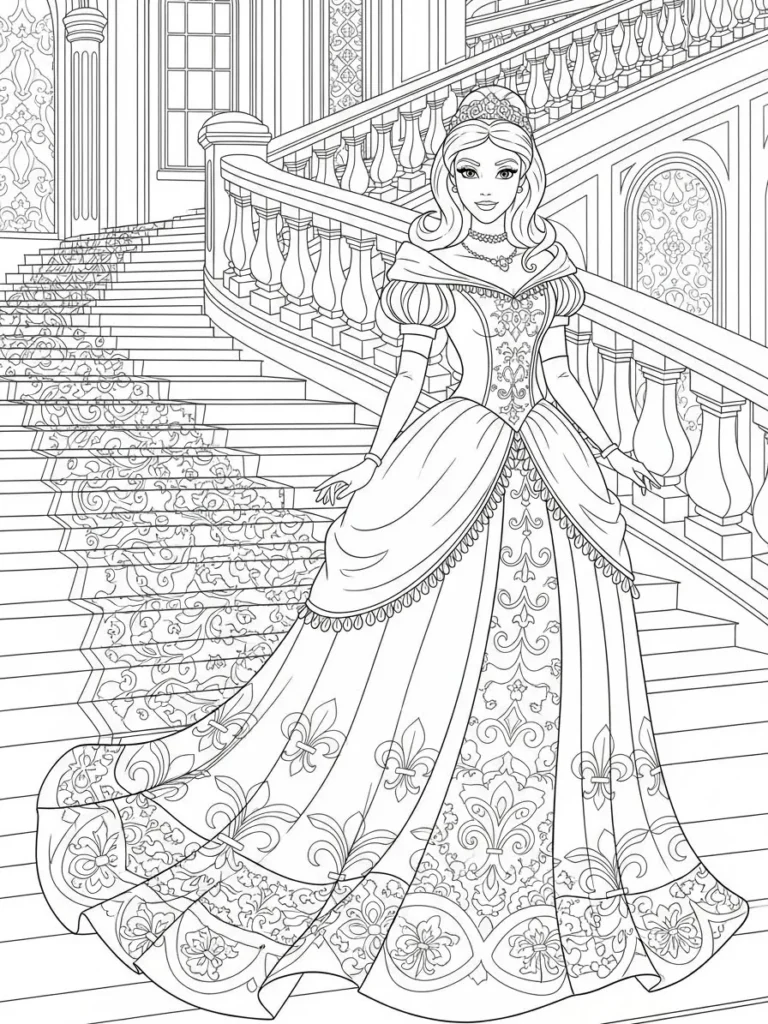This coloring page features a poised princess standing on an elegant sweeping staircase inside a grand palace. Her gown flows dramatically across the steps with ornate floral motifs and classic fleur details decorating the skirt and train. The staircase itself is richly detailed with carved railings and patterned steps that add depth and a strong sense of royalty to the scene. The line work is clean and confident with fine details throughout the dress and architecture while still leaving enough open space to keep the design enjoyable to color.