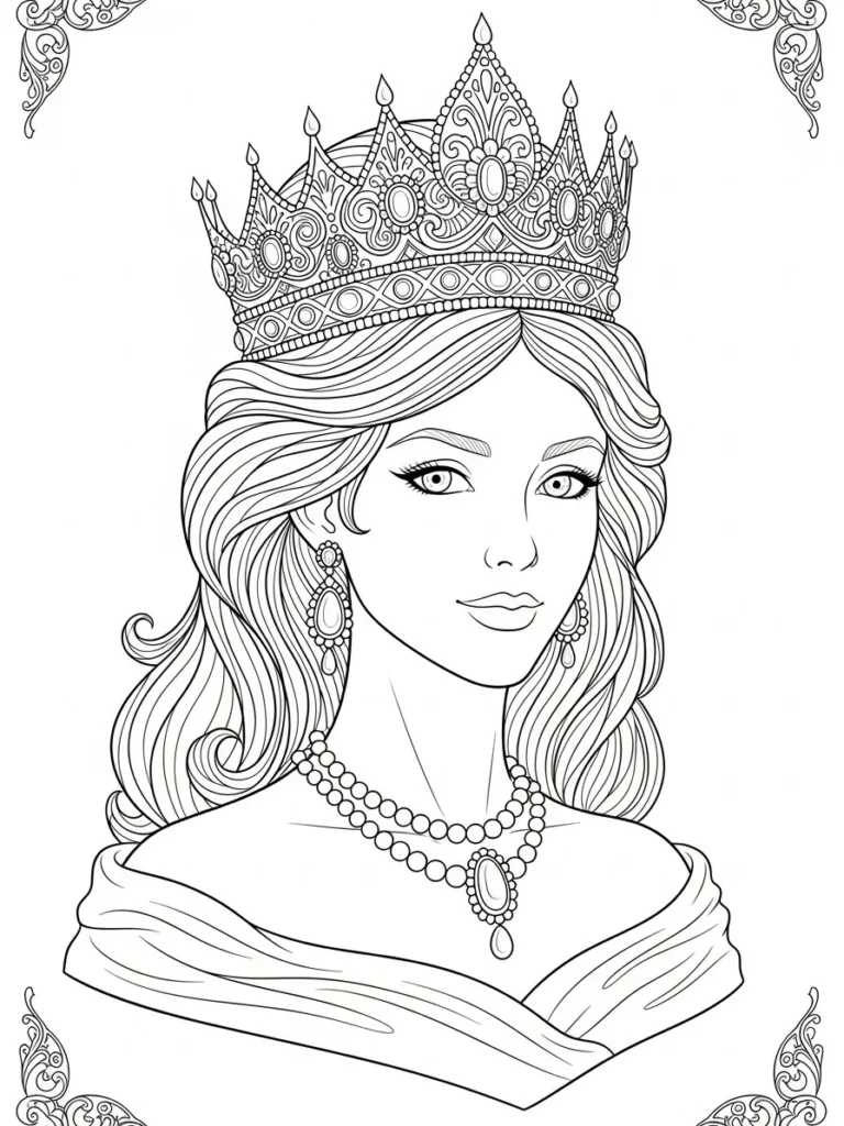 This coloring page features a close up portrait of a regal princess wearing an intricately detailed crown adorned with gemstones and elegant scrollwork. Her flowing hair frames her face softly while delicate jewelry like drop earrings and a beaded necklace adds to the refined royal look. The neckline drapes smoothly, balancing the highly detailed crown and accessories. The line work is clean and precise with fine details in the crown and jewelry and slightly bolder outlines that keep the portrait clear and polished.