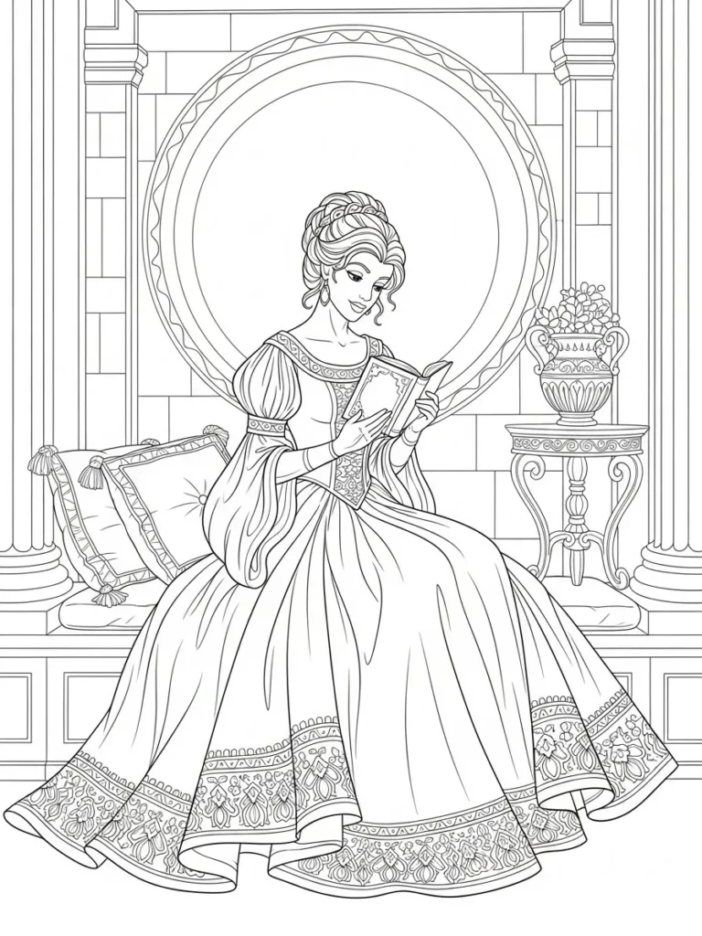 This coloring page features a calm princess seated on a cushioned bench inside a grand palace alcove, gently holding an open book. The scene is framed by tall columns, a circular architectural backdrop, and elegant décor like patterned pillows and a decorative vase filled with flowers. Her gown flows outward in soft folds with ornate borders along the hem that add just enough detail without feeling heavy. The line work is clean and refined with delicate patterns balanced by open spaces that keep the whole design feeling graceful and easy to color.