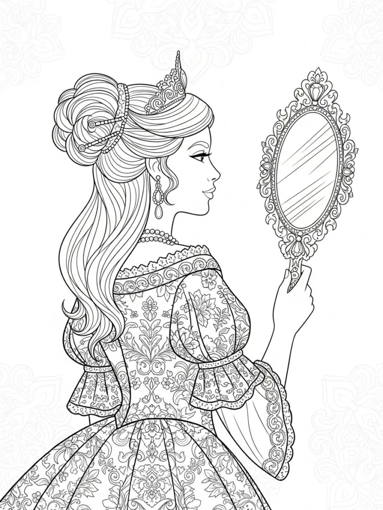 This coloring page shows a regal princess in profile as she admires herself in an elaborate hand mirror framed with swirling royal details. Her hairstyle is beautifully layered with flowing strands gathered into an elegant updo, topped with a delicate crown and beaded accents. The gown is rich with intricate floral patterns and soft decorative borders that repeat across the bodice and sleeves. The line work is clean and refined with fine details for the dress and hair while keeping slightly stronger outlines around the figure so everything feels balanced and easy to follow.