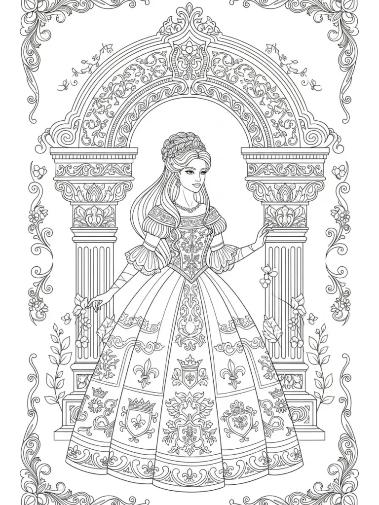 This coloring page features a regal princess standing beneath a grand decorative arch supported by detailed columns and swirling floral accents. Her gown is richly patterned with royal symbols, elegant scrollwork, and structured panels that give the dress a strong ceremonial feel. The arch above her is filled with layered ornamental designs that frame the scene beautifully without overpowering the central figure. Line work is crisp and intricate throughout, with fine details in the architecture and dress balanced by clear outlines that keep everything enjoyable to color.