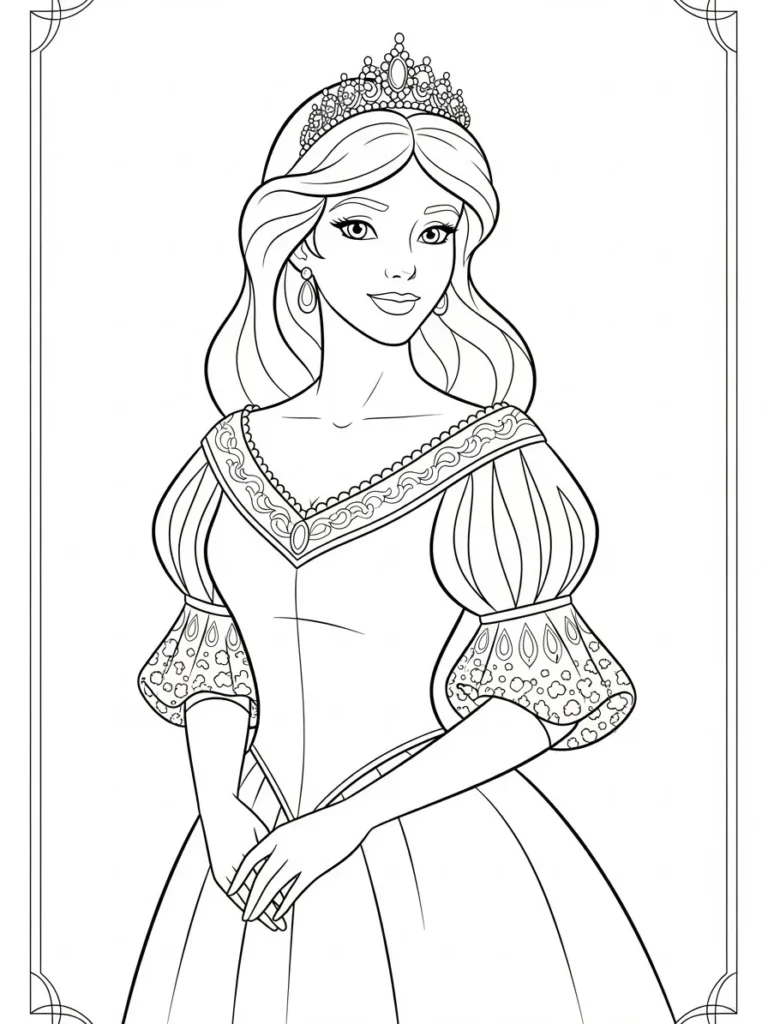 This coloring page features a refined princess shown from the waist up, framed by a soft decorative border that gives the whole design a classic storybook feel. Her jeweled crown sits gently on flowing hair, with clean lines that make the facial features elegant and expressive. The gown is detailed without being overwhelming, with patterned sleeves, subtle textures along the neckline, and smooth panels that balance the look nicely. Line thickness is clear and consistent, making every section easy to color while still offering plenty of detail for an adult coloring experience.