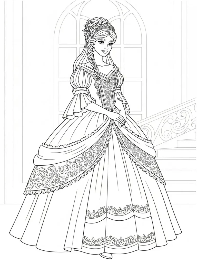 This coloring page features a graceful princess standing near an elegant palace staircase with tall arched windows behind her. Her gown flows outward in layered panels decorated with delicate floral borders and soft ornamental trim along the hem. The bodice is detailed with gentle patterns that add interest without feeling heavy, while her braided hairstyle and small crown bring everything together beautifully. The background architecture stays light and structured, giving the scene a refined royal feel while keeping the princess as the clear focal point.