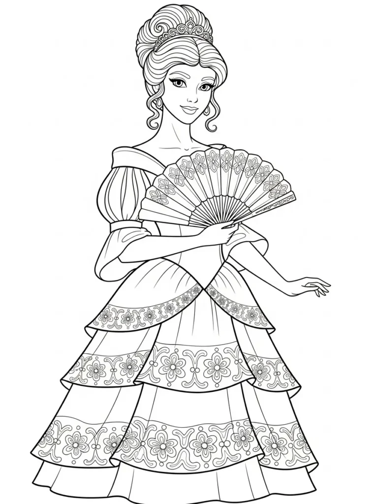 This coloring page features an elegant princess holding a beautifully detailed hand fan that instantly adds a classic royal touch. Her gown flows in layered panels decorated with repeating floral borders and soft ornamental patterns that feel refined without being too busy. The fan itself has delicate line details that mirror the motifs on her dress, creating a cohesive and balanced look. Clean outlines define the figure while finer lines bring out the texture in the fabric and accessories, making the overall layout feel graceful and easy to color.